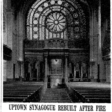 In 1937, very early on the morning of March 27, two fires occurred simultaneously in the basement of the synagogue and caused minor damage. At 10:00am, 700 congregants assembled to celebrate the second seder of Passover. After the congregation departed, a third fire was reported at 3:15pm. This fire damaged the Ark of the Covenant and destroyed 18 hand-illuminated Torah kept in the Tabernacle. The $25,000 pipe organ was badly damaged and the entire south end of the synagogue was wrecked by flames, smoke and the axes of the firefighters. After investigations by the fire marshal, it was discovered that the fires had been set by the synagogue’s caretaker of 24 years who said he’d had an “uncontrollable impulse” to set the blaze. Harry N. Wessel, president of the congregation at the time, told The New York Times: “I am convinced his action is the result of a mental condition and that no vicious tendencies animated his act.”